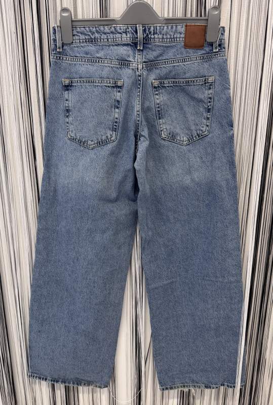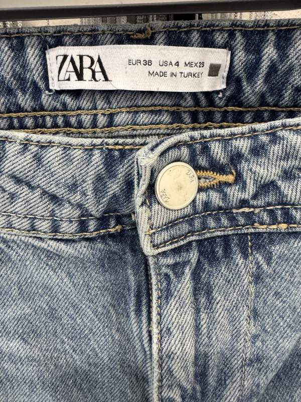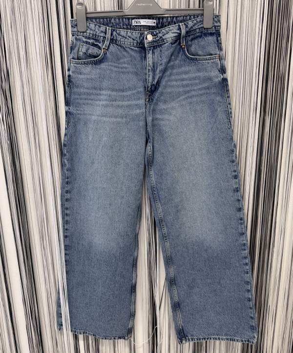 Popis | Dámské zvonové džíny značky - Zara, modré barvy. Uvedená šířka je měřena přes boky. Kalhoty velmi pěkné, kosmetická vada na nohavici viz foto. Jinak top. Second hand. |