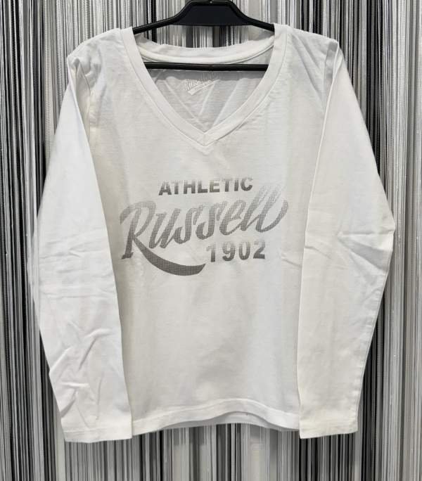 | Popis | Dívčí tričko s dlouhým rukávem, značky Russell Athletic, bílé barvy s nápisem na přední straně. Uvedená délka rukávu je měřena od ramene. Tričko sportovnější, velmi pěkné. Second hand. |