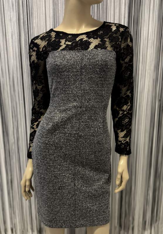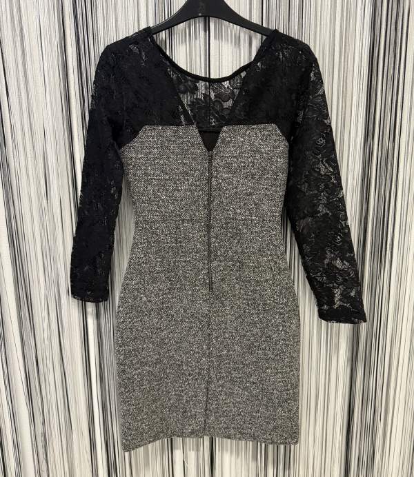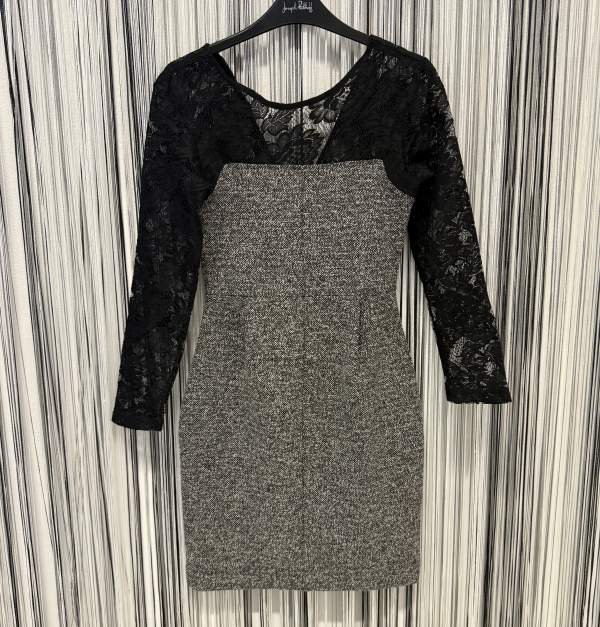 | Popis | Dámské úpletové šaty značky French Connection, šedo-černé barvy. Uvedená šířka je měřena přes boky. Šaty velmi pěkné, bez vad, top stav. Second hand. |