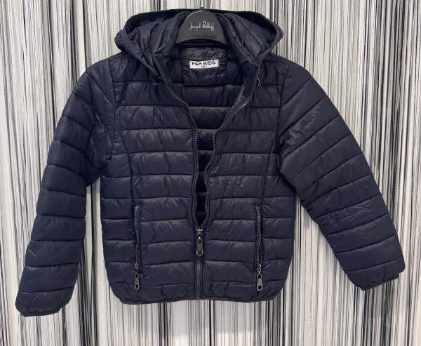 Popis | Dívčí i chlapecká prošívaná bunda značky F&H Kids, námořnické modré barvy. Uvedená délka rukávu je měřena od ramene, sundavací kapuce. Bunda velmi pěkná, jako nová, bez vad. Second hand. |